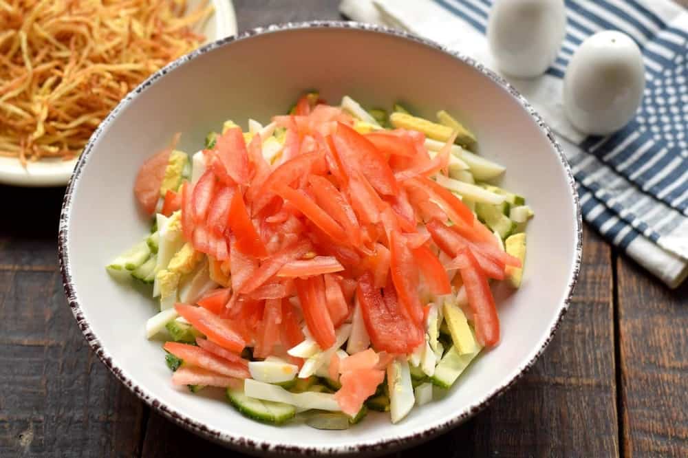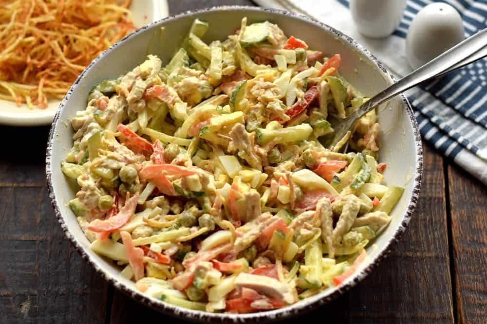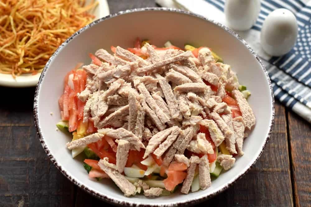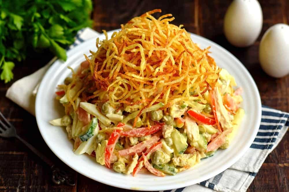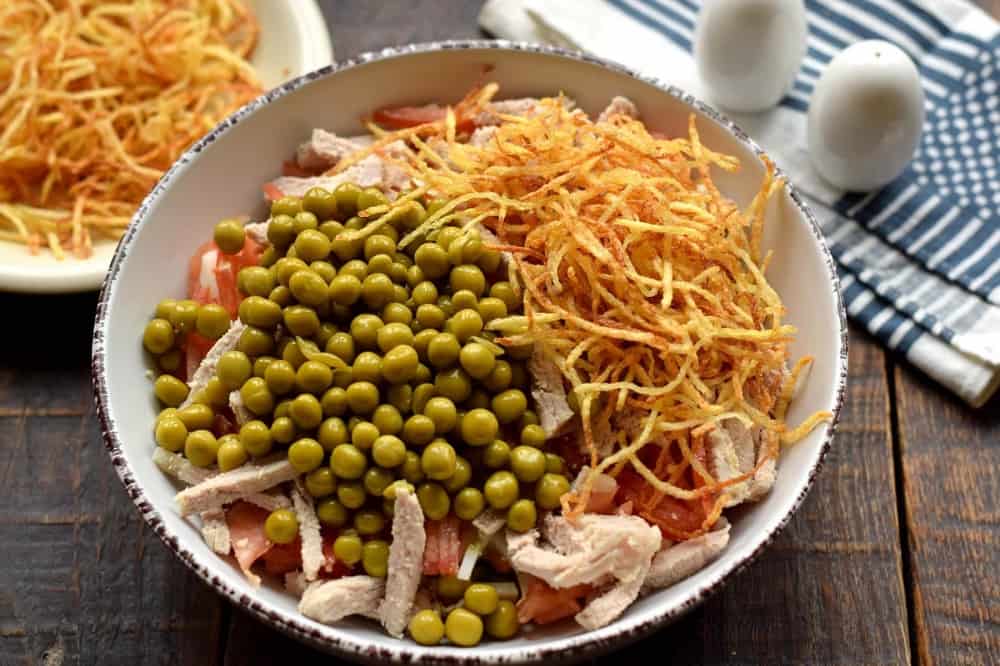 Рецепт смачного та ситного салату, який можна подати як на святковий стіл, так і до повсякденної трапези. М’ясний салат доповнюємо соковитими овочами – помідором, огірком та консервованим горошком. Родзинкою салату є картопля Пай. ЇЇ можна придбати в магазині або приготувати самостійно із сирої картоплі. Хрумкі смужки картоплі відмінно вписуються в салат, роблячи його оригінальним.