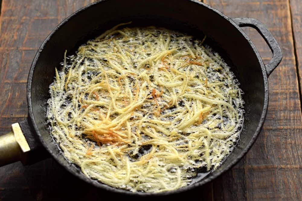У сковороду влийте велику кількість олії, нагрійте її до піка. У розпечену олію покладіть суху картопляну стружку. Смажте картоплю в олії, поки вона не набуде золотистого кольору.