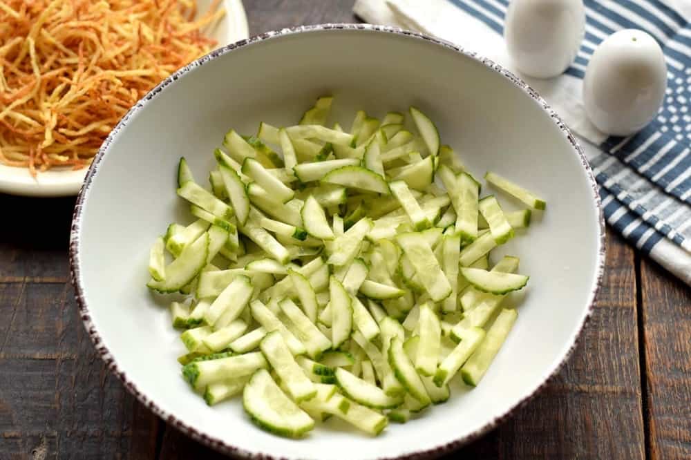 Можна починати збирати салат. Свіжі огірки наріжте тонкою соломкою, закиньте в салатник.