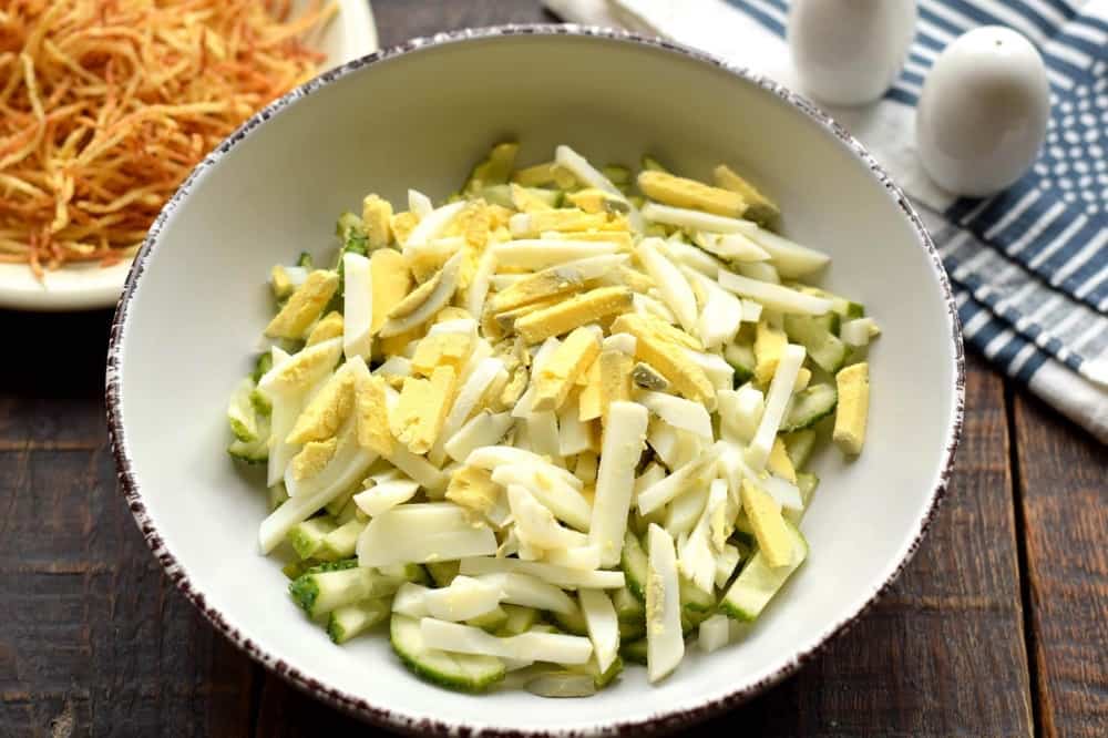 Яйця відваріть круто, очистіть і наріжте смужками, додайте до огірків.
