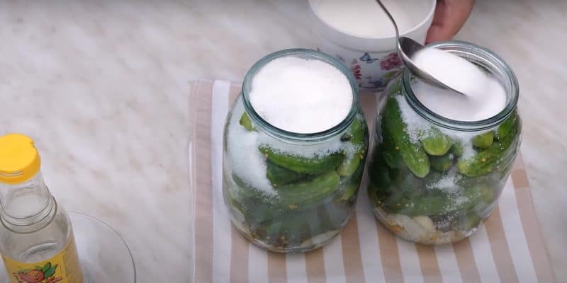 У банки додаємо сіль та цукор, оцет і заливаємо окропом.