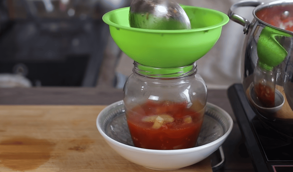 Розкладаємо перець по стерилізованих баночках, трохи ущільнюємо та заливаємо томатним соусом із каструлі.
