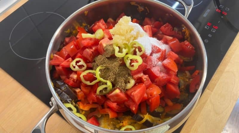 Баклажани ріжемо шматочками, цибулю – кубиками, солодкий перець соломкою, моркву трем на великій тертці. Гострий перчик та часник дрібно рубаємо.