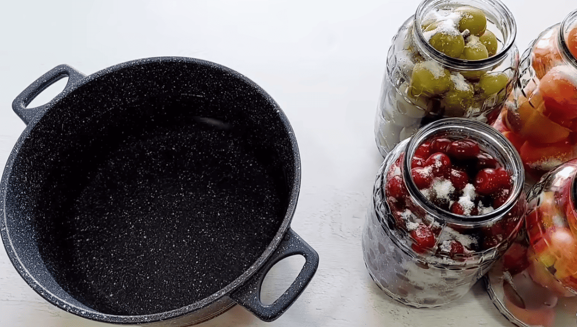 Промиваємо фрукти та ягоди у кількох водах, розкладаємо у чисті банки та заливаємо окропом. Банки попередньо миті, стерилізовані.
