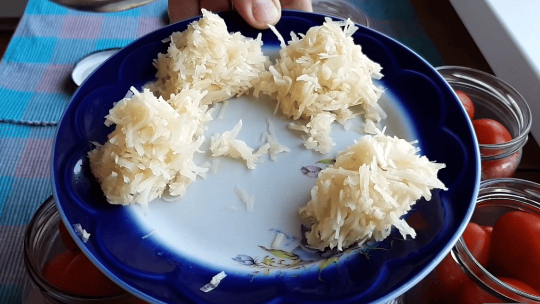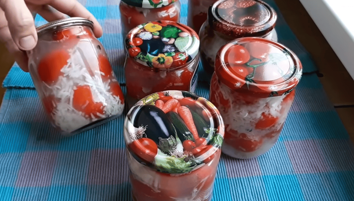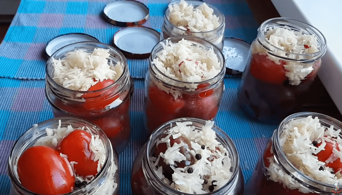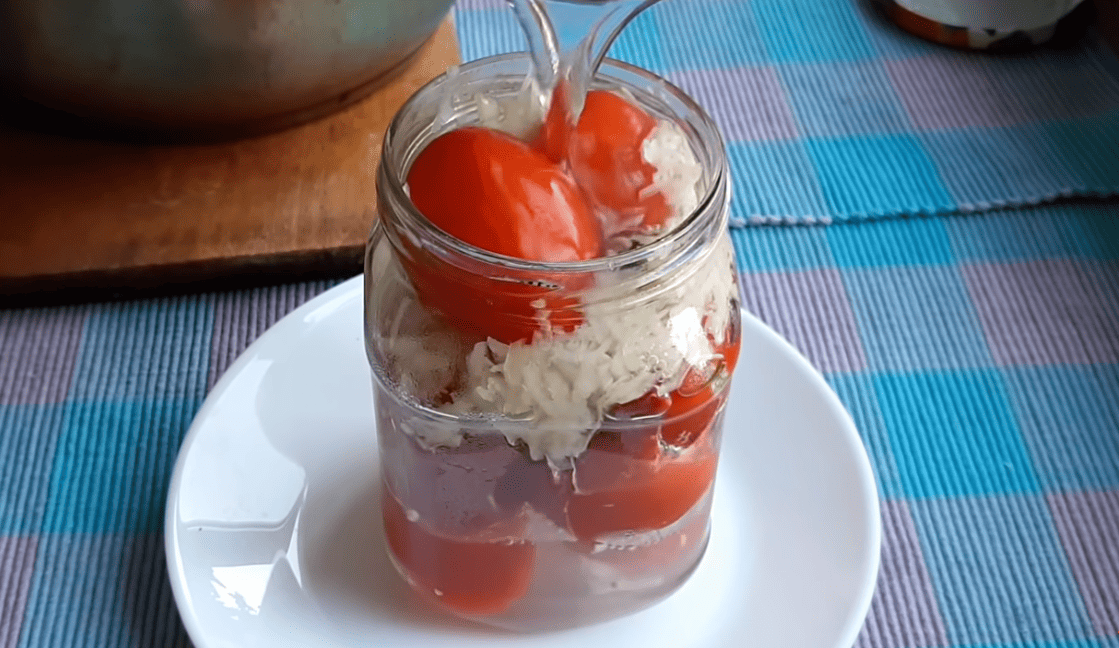 Цей рецепт більш відомий під назвою “Помідори в снігу”, за рахунок того, що в баночці вони виглядають дуже оригінально в маринаді з великою кількістю тертого часнику.