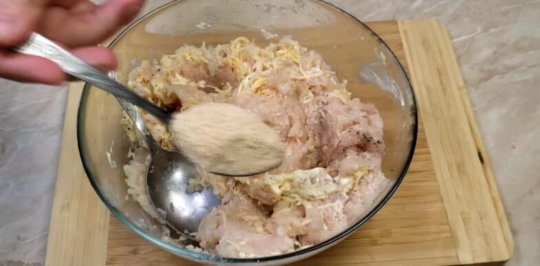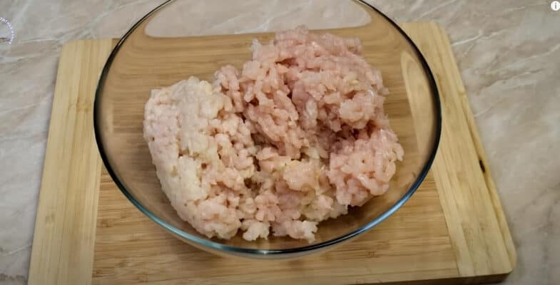 Куряче філе, часник і цибулю я перекрутила у фарш. Ви можете купити готовий і просто натерти до нього цибулю і часник на дрібній тертці.