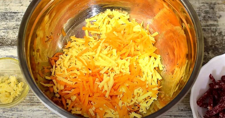 Моркву і твердий сир тру на терці у миску.