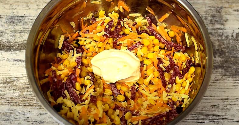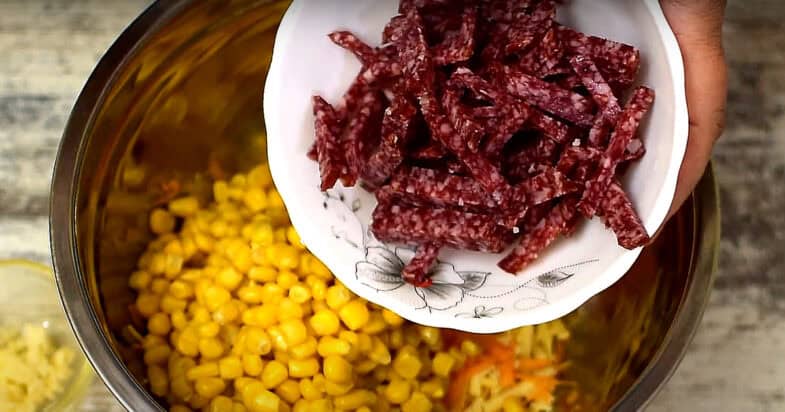 Додаю кукурудзу, ковбасу порізану соломкою.