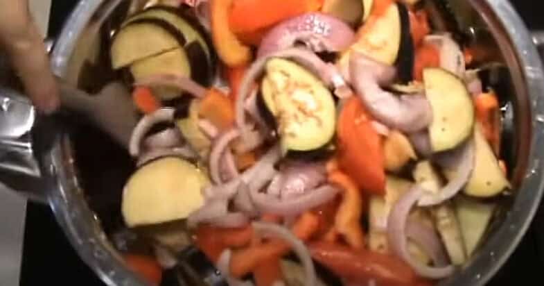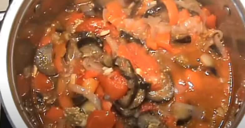 Ставлю на середній вогонь велику й глибоку каструлю. Вливаю туди олію. Тепер шарами викладаю овочі: спочатку йдуть помідори, потім баклажани, перець, цибуля, і наостанок часник.