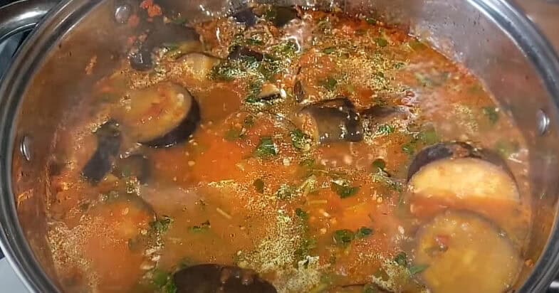 Соус трішки проварився – тепер саме час додавати баклажани. Засипаю їх у каструлю й обережно перемішую. Поки вони ще не закипіли, можна спокійно помішати ложкою. Але коли вже починають варитися, краще їх не колотити, щоб не розлазилися. Просто притискаю ложкою зверху, ніби придавлюю. Накриваю кришкою й варю 10 хвилин. Час від часу відкриваю й знову акуратно придавлюю, щоб усі баклажани просочилися соусом.
