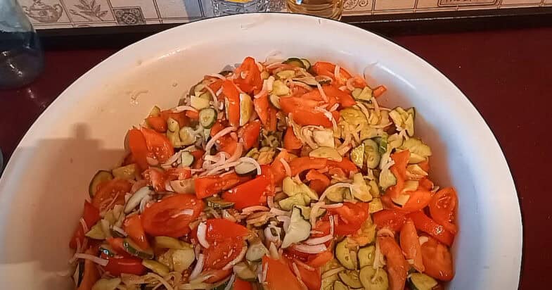 Спершу беру цибулю. Яку б не мала, ділю на чотири частини, а тоді тонесенько нарізаю, зовсім прозорими скибочками. Далі огірки. Молоденькі можна різати просто так, а якщо старіші – то шкірку краще зрізати. Нарізаю тоненькими кружальцями, 2–3 мм, не товще. Бо як будуть грубі, то не проваряться як слід. Тепер беруся до помідорів. Їх ріжу трішки більшими шматочками, ніж огірки. Бо вони швидко розварюються.