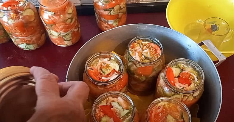 Потім банки закручую ключем, накриваю ковдрою і залишаю до повного вистигання. Ось і все, дівчатка, салат на зиму – готовий. Зимою відкриваю баночку – і ніби щойно з городу принесла огірки й помідори. Дуже смачно!