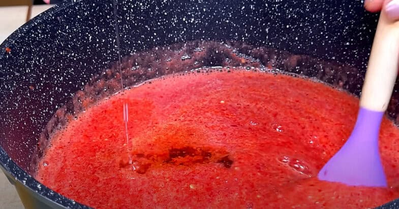 Тим часом беру помідори. У мене «сливка», я просто зрізаю плодоніжку й розрізаю навпіл. Шкірку не знімаю, бо все одно буду перебивати в блендері. Якщо хтось любить без шкірки — можна надрізати й обдати окропом, тоді вона легко знімається. Помідори я перебиваю блендером у пюре й одразу відправляю в каструлю. Туди ж додаю перець, який я порізала смужками і також перебила блендером. Якщо блендер не справиться, можна й на м’ясорубку перекрутити. Виходить гарна однорідна маса.
