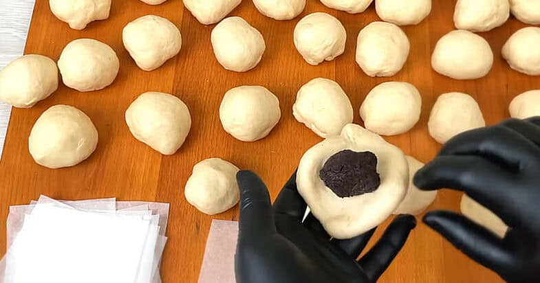Формую пампухи. Тісто за годину чудово підросло, стало м’яке і ніжне. Ділю тісто на шматочки по 75-80 г і з кожного формую кулю, добре натягуючи верх і ховаючи шов під низ. Ще раз округлюю, прокочуючи долонею по дошці, накриваю рушником і залишаю на 10 хвилин. Потім беру кульку, перевертаю швом догори, розплющую в коржик товщиною приблизно 0,5 см, у центр викладаю макову начинку. Заліплюю спочатку як вареник, а потім з’єдную обидва кінці в центрі, як вузлик, і добре прокатую між долонями, щоб шви зникли. Викладаю пампух гладкою стороною догори на квадратик пергаменту. Так формую всі заготовки.