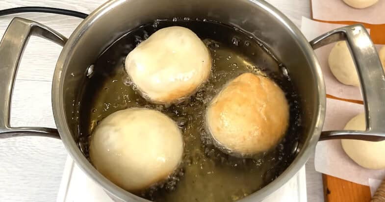 У товстостінну каструлю наливаю 1 літр олії і нагріваю до 170–175°C. Якщо немає термометра — кидаю шматочок тіста: якщо спливає і рум’яниться, олія готова. Викладаю пампухи разом із пергаментом, папером донизу. Не кладу багато за раз — пампухи не люблять тісноти і ще підростають у процесі смаження. Через кілька секунд витягаю пергамент, а пампухи смажу, періодично перевертаючи. Готові пампухи одразу викладаю на паперові рушники, щоб забрати зайвий жир.