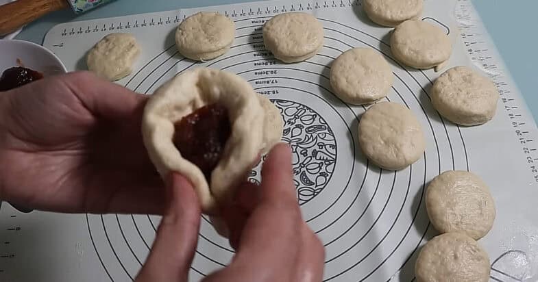 Коли тісто збільшилося в об’ємі, я змащую руки олією, обминаю його і починаю формувати пампухи. Поверхню злегка збризкую олією, тісто трохи розкачую до товщини приблизно 1 см і вирізаю кружечки. Сьогодні я готую пампухи з абрикосовим повидлом — начинка обов’язково має бути густою. Кладу начинку, защипую краї, як на вареники, і формую акуратні кульки. Викладаю їх на змащену поверхню й залишаю ще трохи підрости, поки розігрівається олія.
