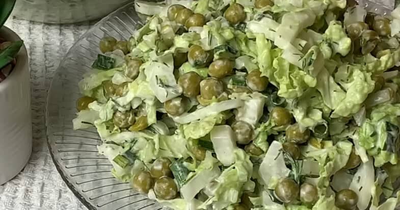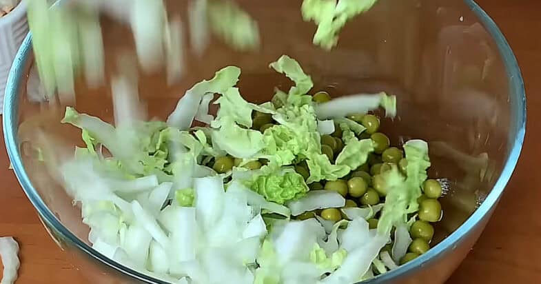 Беру банку консервованого зеленого горошку. Також додаю пекінську капусту, нарізаю тоненькою соломкою і використовую не лише зелену, а й білу частину. Вона соковита, ніжна, трохи солодка і для салатів підходить ідеально. До капусти додаю невеликий пучок кропу та зеленої цибулі, дрібно нарізаю — аромат одразу стає домашній і свіжий.