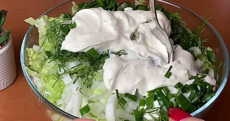 Далі я готую просту, швидку, смачну й корисну заправку. У мисочку кладу сметану, зубчик часнику і пропускаю його через прес. Всипаю невелику дрібку чорного меленого перцю, сіль додаю за смаком. Ще кладу гірчиці — вона дає легку пікантність і робить смак більш виразним. Готову заправку відправляю до салату і все добре перемішую.