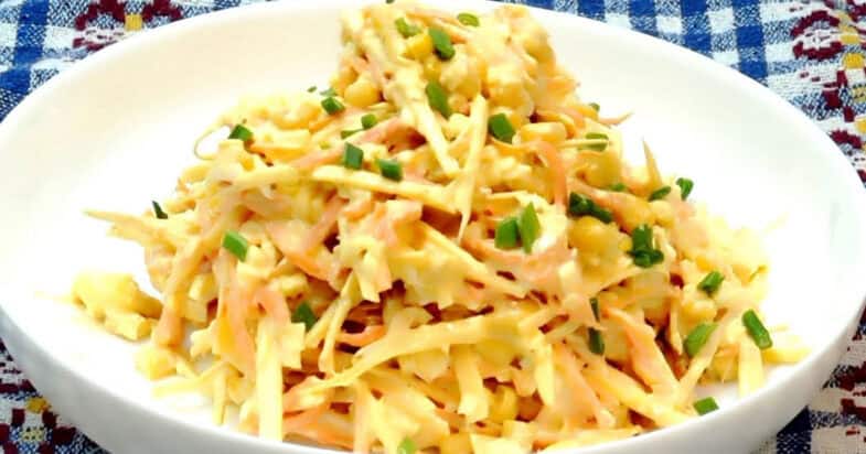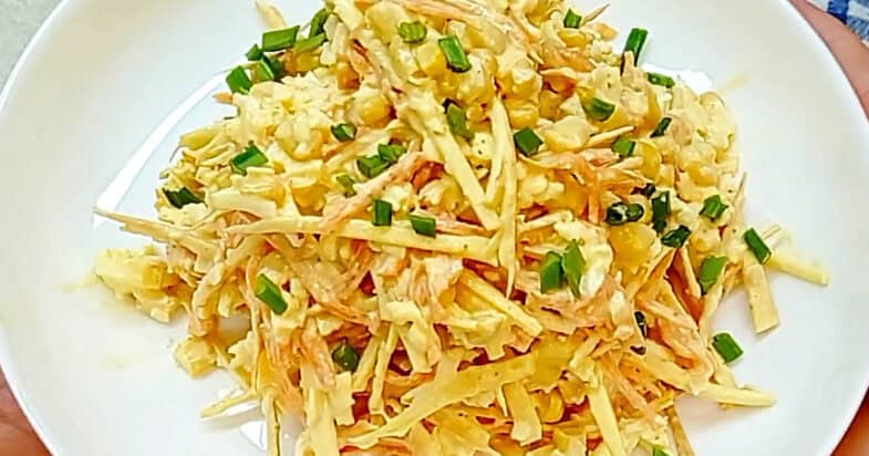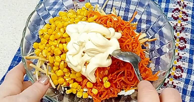 Потім додаюкукурудзу і, звичайно ж, майонез. Усе ретельно перемішую до однорідності. Обов’язково куштую салат: якщо потрібно, я підсолюю та додаю чорний мелений перець за смаком. Після цього викладаю салат на сервірувальну страву та за бажанням прикрашаю.