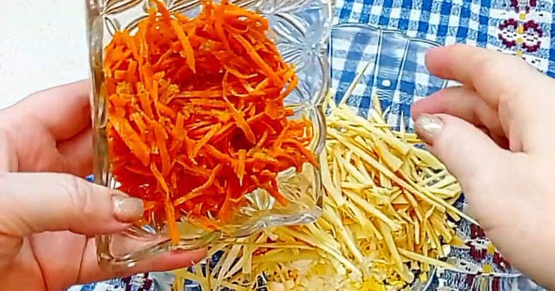 Яйця, зварені круто, я натираю на тертці або подрібнюю ножем чи навіть розминаю виделкою — роблю так, як мені зручно. Далі я беру копчений сир косичку. Я нарізаю його на шматочки довжиною 5–6 сантиметрів і розділяю на тоненькі волокна. Можна використовувати і звичайний сир косичку — тоді я також нарізаю його на шматочки та розбираю на дрібні волокна. А можна взяти просто копчений сир і натерти його на тертці — вигляд буде трішки інший, але смак залишиться таким же чудовим. Підготовлений сир я перекладаю в миску до яєць. Тепер я додаю корейську моркву. Якщо вона довга, я злегка її подрібнюю, щоб шматочки були приблизно по 5–6 сантиметрів.
