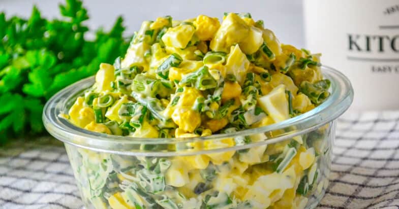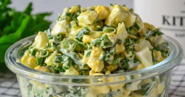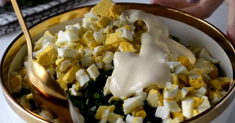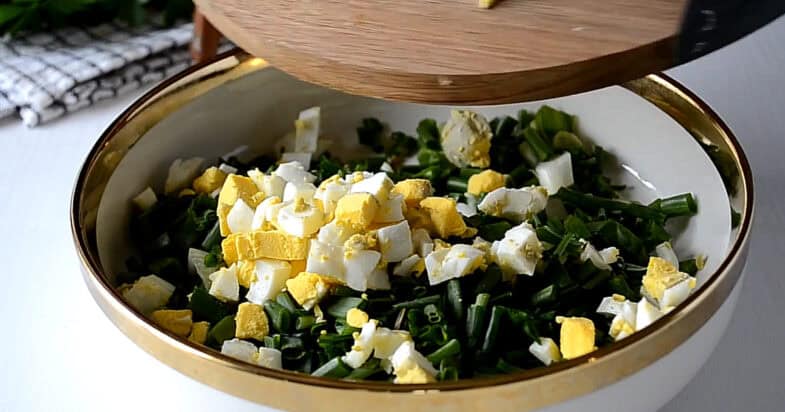 Для цього салату мені потрібен досить великий пучок зеленої цибулі, і я використовую тільки зелену частину. Цибулю я ретельно промиваю, злегка обсушую і дрібно нарізаю — чим дрібніше, тим ніжнішою буде текстура салату. Курячі яйця я попередньо відварюю, даю їм охолонути, очищаю від шкаралупи і нарізаю невеликим кубиком. Змішую яйця з нарізаною зеленою цибулею.