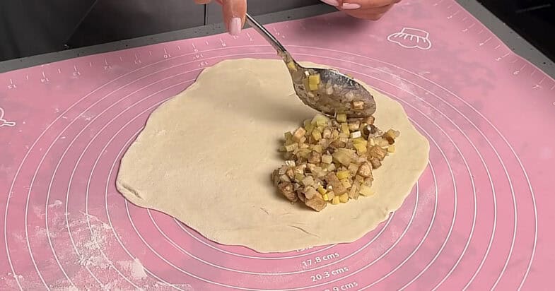 Тісто ділю на дві частини, кожну нарізаю на порційні шматочки і розкачую дуже тонко, присипаючи поверхню борошном. На одну половину викладаю приблизно по 1 столовій ложці начинки, не доходячи до краю, накриваю другою половиною і ретельно защипую краї. За бажанням обрізаю рівніше і проходжуся виделкою, щоб зробити візерунок і краще скріпити.