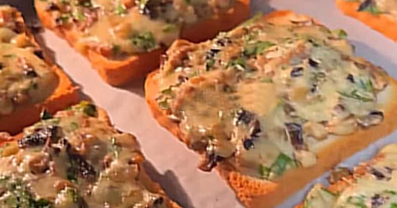 Другий варіант — рибні бутерброди з печерицями, вони виходять дуже соковиті та ароматні. Печериці я добре промиваю, за бажанням очищаю і нарізаю дуже дрібними кубиками. Так само дрібно нарізаю цибулину. На розігріту сковорідку наливаю олію, викладаю цибулю та печериці й обсмажую на невеликому вогні, постійно помішуючи, до золотистого кольору. Моцарелу натираю на дрібній тертці, зелень (у мене петрушка) дрібно нарізаю і поєдную все в мисці. Додаю обсмажені гриби з цибулею, солю, перчу за смаком, додаю крем-сир і добре перемішую. На пергамент викладаю тостовий хліб, зверху кладу по одній столовій ложці начинки і розрівнюю ложкою. Випікаю при температурі 200 градусів приблизно 12–15 хвилин. Готові бутерброди посипаю зеленню, у мене це кріп, і подаю гарячими.