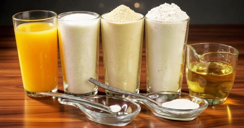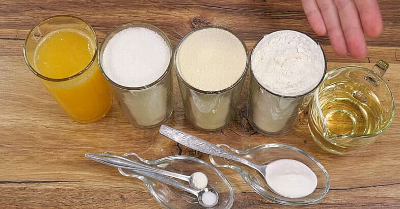 Використовую стандартну склянку 200 грамів. Беру неповну склянку свіжовичавленого апельсинового соку, саме фреш, не пакетований. Додаю неповну склянку цукру, але його кількість можна регулювати за смаком, особливо якщо використовуєте магазинний сік — тоді цукру потрібно у 2–3 рази менше. Додаю 1 склянку манної крупи, 1 склянку борошна — це приблизно 160 грамів, хоча якщо борошно просіяне, може бути й 140 грамів, а якщо щільно набране — навіть 170–180 грамів. Вливаю пів склянки олії — це 100 грамів. Додаю десертну ложку з гіркою розпушувача (10 грамів) або замінюю його на 1 чайну ложку соди (5 грамів), на кінчику ножа — по 0,5 грама солі та ваніліну, і обов’язково цедру одного великого апельсина, знімаю тільки помаранчеву частину без білого шару.