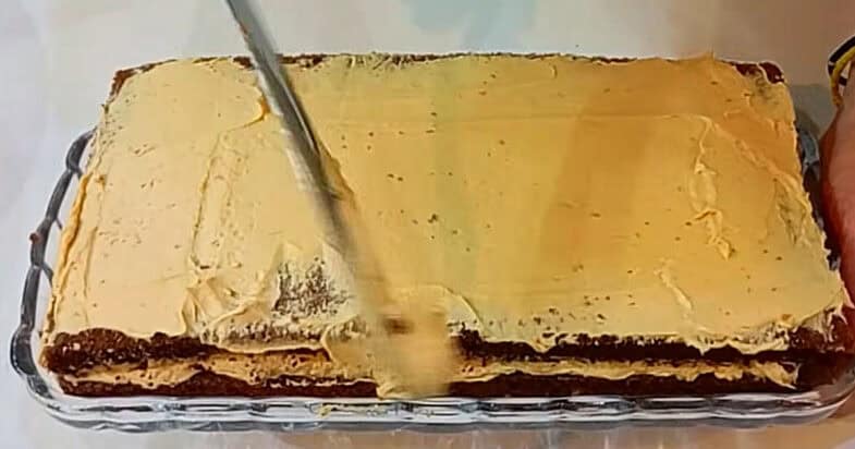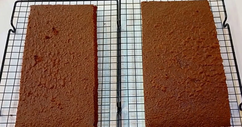 Я виливаю його на велике стандартне деко розміром 30×40 см, злегка розрівнюю лопаткою, легенько стукаю формою об стіл і ставлю випікатися при 200 градусах приблизно на 15 хвилин. Готовий корж я перевіряю зубочисткою або просто натискаю пальцем — він пружний і повністю пропечений. Перекладаю його на дошку, обрізаю краї, щоб торт був рівний, а обрізки відкладаю — з них я роблю крихту для обсипання. Корж розрізаю навпіл, він дуже м’який, вологий, шоколадний і зовсім не потребує просочення.