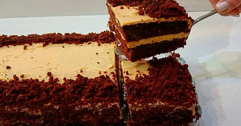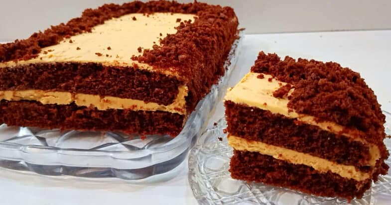 Обрізки я подрібнюю в крихту і щедро обсипаю торт з усіх боків. Даю торту настоятися в холодильнику 6–8 годин, після чого нарізаю. На розрізі він виходить дуже соковитий, вологий, насичено-шоколадний із ніжним карамельним кремом. Це простий, доступний рецепт із продуктів, які завжди є вдома, а результат просто чудовий. Обов’язково спробуйте приготувати — впевнена, вам сподобається. Смачного!