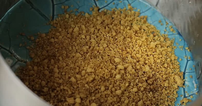 У миску висипаю борошно та цукру й перемішую ложкою до однорідності. Вершкове масло обвалюю в борошні й натираю на великій тертці прямо в суху суміш, періодично занурюючи шматочок масла в борошно, щоб процес ішов швидше. Після цього я перетираю борошно, цукор і масло руками до стану дрібної крихти, схожої на пісок. Ложкою це робити незручно, а руками маса перетворюється на крихту буквально за кілька хвилин. Готову крихту я висипаю на суху антипригарну сковороду й постійно помішую, обсмажуючи до красивого золотистого кольору. Я розділила крихту на дві частини й обсмажую її по черзі, хоча якщо є дві сковорідки — можна працювати швидше. Сковороду я нічим не змащую. Під час обсмажування потрібно постійно перемішувати крихту, щоб вона рівномірно підрум’янилася і не підгоріла. Уже через хвилину отримую гарну золотисту крихту, дуже дрібну й однорідну.