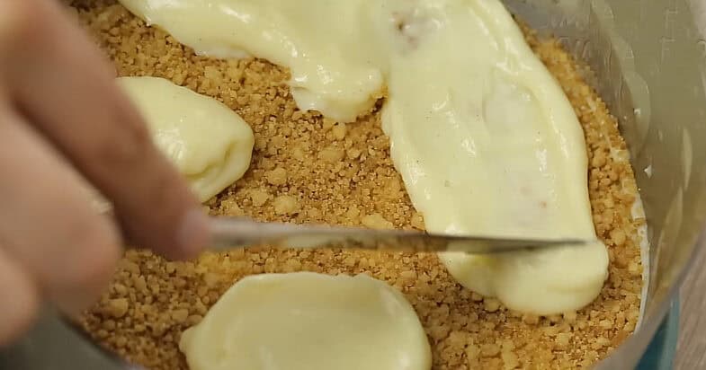 Тепер я збираю торт за допомогою кондитерського кільця діаметром 19 см. Для зручності я роблю бортики з файлу, вирізаю смужки, змащую їх олією й приклеюю до внутрішньої частини форми — так торт легше знімається і бічні сторони залишаються рівними й красивими. На дно я висипаю кілька ложок обсмаженої крихти й рівномірно розподіляю тонким шаром. Зверху викладаю 2 ложки крему й дуже акуратно розрівнюю, щоб крихта не тягнулася за ложкою й не змішувалася з кремом. Таким чином формую шари: крихта — крем — крихта — крем, усього у мене вийшло 6 шарів. На верхній шар я викладаю приблизно 3–4 столові ложки крему й ретельно вирівнюю поверхню. Готовий торт накриваю харчовою плівкою і ставлю в холодильник на 2-3 години, а найкраще — на ніч.