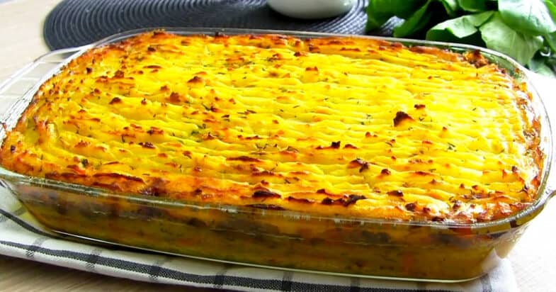 Додаю до пюре другу половину засмажки з моркви та цибулі, солю за смаком, всипаю подрібнений кріп і все добре перемішую. Форму для запікання 20×30 см змащую олією та викладаю половину ще гарячого картопляного пюре, рівномірно розподіляю його по дну.