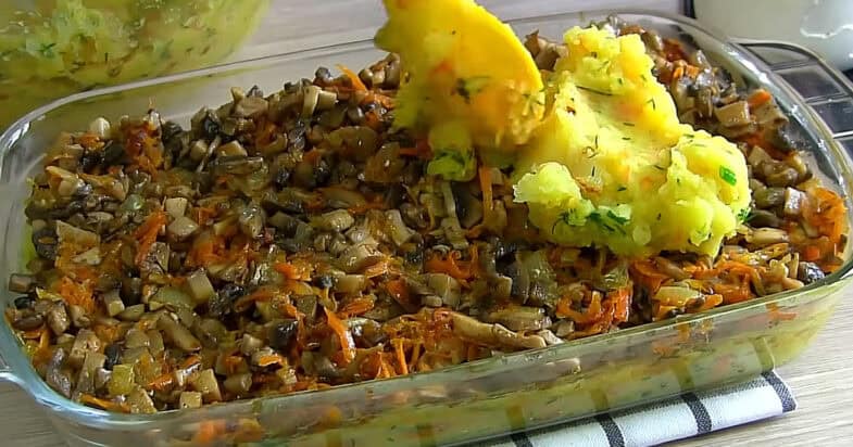 Зверху викладаю всю грибну начинку, а потім накриваю рештою картоплі та знову розрівнюю. Виделкою проходжуся по поверхні, роблю невеличкий візерунок. Ставлю запікатися в розігріту духовку при температурі 190–200 градусів приблизно на 35–40 хвилин.