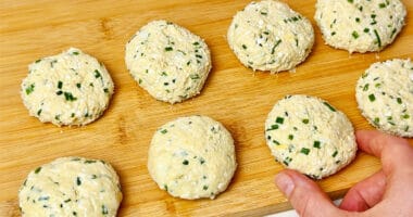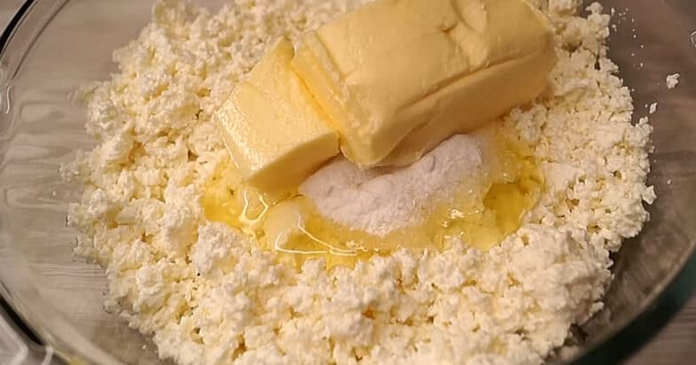 Найголовніше — це якість сиру: якщо він із добавками, нічого не вийде. Я використовую домашній сир, попередньо заморожую його в морозильній камері, а потім розморожую — так він стає дрібнозернистим, більш повітряним і краще збивається у кремову масу. Якщо не заморожувати, тоді я обов’язково перетираю сир через сито. До сиру я додаю яйце, солі, цукру та соди, а також вершкового масла кімнатної температури й усе ретельно перебиваю блендером до однорідної гладкої консистенції.