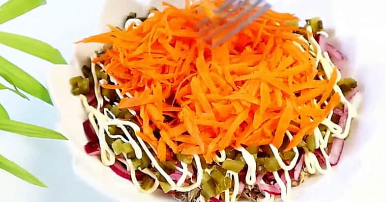 Наступним шаром я нарізаю солоні огірочки дрібним кубиком і викладаю поверх цибулі, знову покриваючи все майонезною сіточкою. За рецептом додається варена морква, але я беру невелику сиру морквину — натираю її і викладаю тонким шаром, мені так смакує більше, салат виходить соковитіший і свіжіший. І знову трохи майонезу зверху.