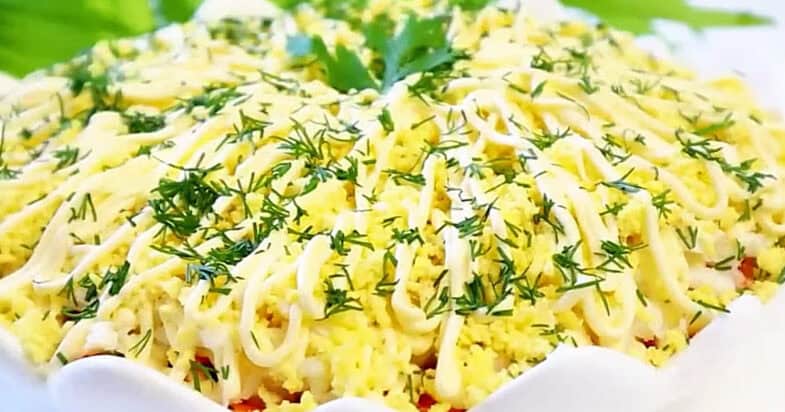 Відварені яйця розділяю на білки та жовтки: білки натираю на великій тертці і щедро викладаю поверх, добре покриваючи майонезом, щоб шар був ніжний і повітряний. Далі додаю панірувальні сухарі. Чесно кажучи, спочатку я не зовсім розуміла їхню роль, але в готовому салаті вони додають легку текстуру і цікаву нотку. Зверху посипаю все натертими жовтками, роблю ще одну легку майонезну сіточку і завершую щедрою жменею дрібно нарізаного кропу. Салат виходить дуже смачний, простий у приготуванні, але водночас гідний святкового столу!