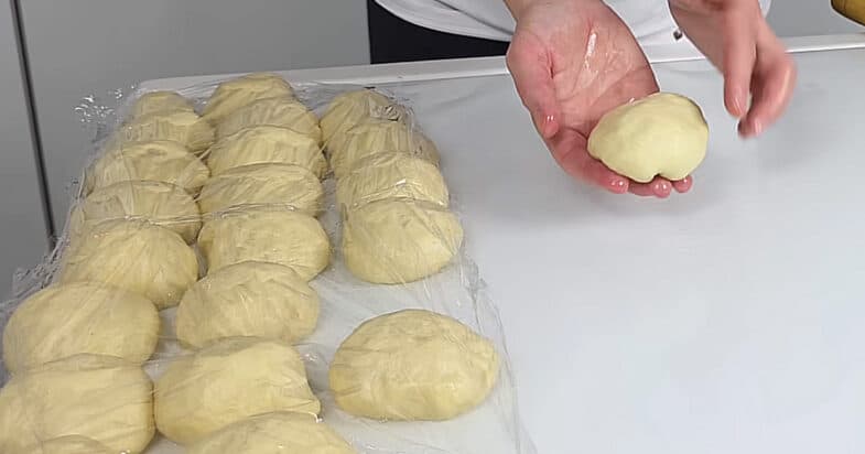 Тісто підходило рівно 1 годину, я ділю його на кульки, даю їм постояти 5–10 хвилин, формую вироби і ще раз залишаю підійти перед випіканням — це обов’язково для пухкої випічки.