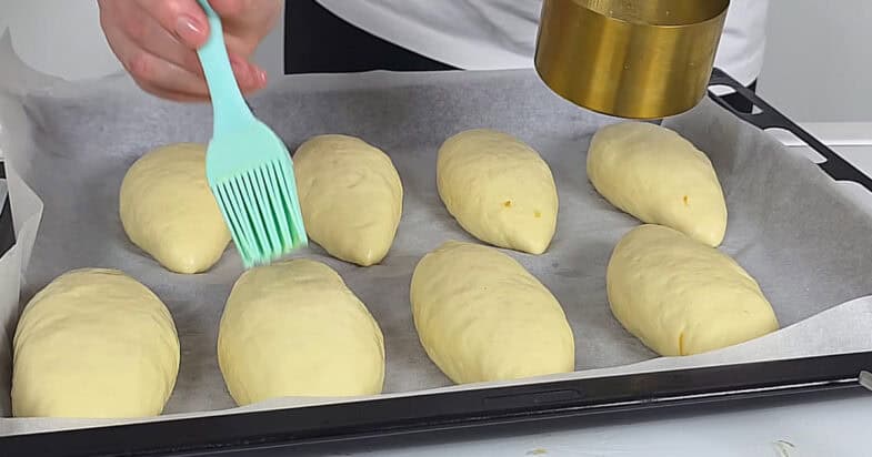 Сформовані пиріжки, викладаю на деко застелене пергаментом, змащую жовтком з молоком і випікаю при 180 градусах 20–25 хвилин до рум’яності. Я люблю більш рум’яну скоринку, тому іноді тримаю ще 5 хвилин.