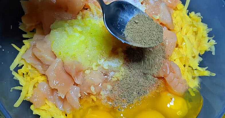 Картоплю та цибулю натираю на терці, філе нарізаю дрібними шматочками, видавлюю через прес часник, розбиваю яйця, додаю сіль, перець, борошно, перемішую.