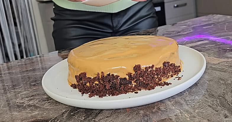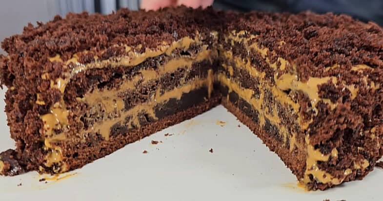 Коли торт добре настоявся, подрібнюю обрізки бісквіта — я натираю їх на тертці, щоб вийшла дрібна крихта. За бажанням до неї можна додати подрібнені підсмажені волоські горіхи або трохи натертого шоколаду, але навіть без добавок виходить дуже смачно. Зверху і з боків змащую торт залишками крему і щедро обсипаю крихтою. Крем має ніжний карамельний смак, а шоколадні коржі роблять торт особливо ароматним. У результаті виходить дуже м’який, добре просочений і неймовірно смачний десерт. Цей торт готується без міксера, без ваг і з найпростіших продуктів, але виходить справді святковим. Обов’язково спробуйте приготувати — впевнена, що цей швидкий і недорогий торт стане одним із ваших улюблених до чаю.