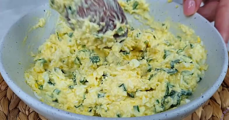 Варені яйця натираю на дрібній тертці, додаю до них майонез і дрібно нашатковану зелену цибулю. Усе це трохи підсолюю за смаком і добре перемішую, щоб вийшла однорідна, ніжна та ароматна маса. Нарізаю філе оселедця невеликими акуратними шматочками.