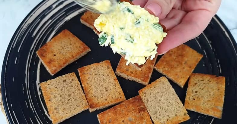 Беру хліб, зрізаю з нього скоринки, а один шматочок ділю на дві частини, щоб бутерброди були зручними та красивими для подачі. Після цього викладаю підготовлені шматочки хліба на суху сковороду і злегка підсмажую їх з обох боків до приємної рум’яної скоринки. Хліб стає ароматним, хрустким і чудово підходить для такої закуски.