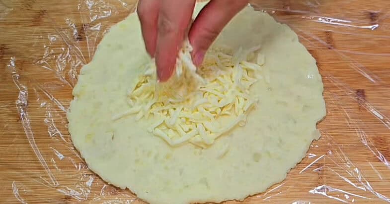 Ділю тісто на 4 частини, формую кульки. На стіл викладаю харчову плівку, з кульок розкачую руками коржики і викладаю тертий на терці сир. Формую прямокутні пиріжки, допомагаючи собі плівкою, щільно защіпаючи тісто.