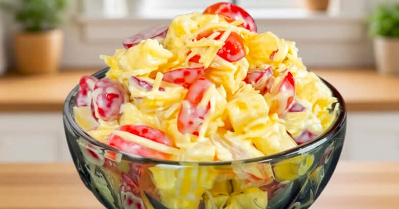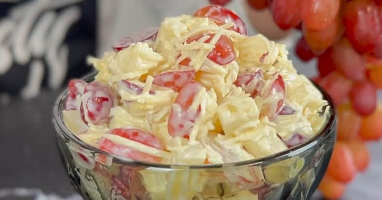У результаті виходить дуже швидкий і водночас оригінальний салат — солодкий, ніжний і трохи пікантний. На його приготування потрібно всього 2–3 хвилини, а виглядає і смакує він так, ніби ви витратили значно більше часу. Я подаю його одразу після приготування, і він завжди зникає зі столу одним із перших. Спробуйте і ви таке поєднання винограду, сиру та ананаса — впевнена, що цей простий салат приємно здивує вас і ваших близьких. Смачного!