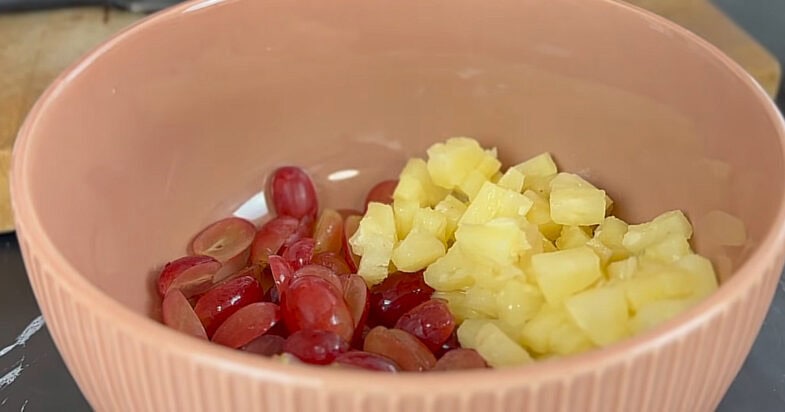 Спочатку я беру виноград без кісточок. Якщо ягоди великі — залишаю їх цілими, а якщо невеликі, то просто розрізаю навпіл. Підготовлений виноград перекладаю у зручну миску. Далі додаю консервований ананас — його повинно бути приблизно стільки ж, скільки і винограду, тоді смак буде ідеально збалансований. Ананас можна брати шматочками або кільцями — у будь-якому разі я просто нарізаю його невеликими кубиками і додаю до винограду.