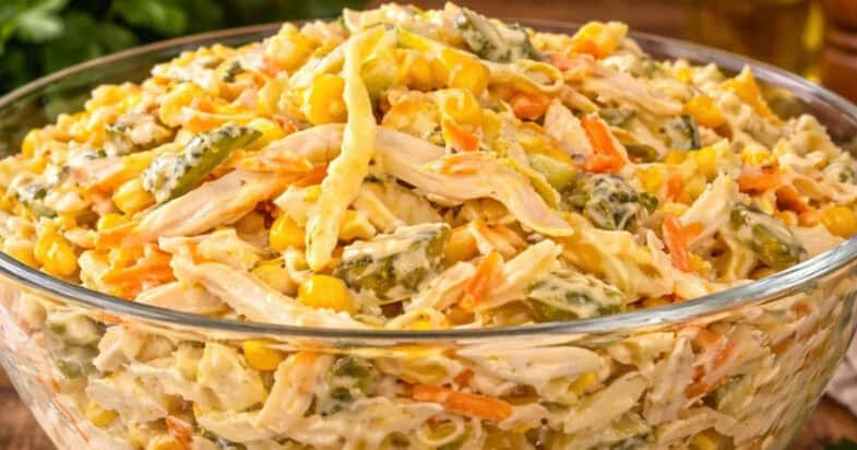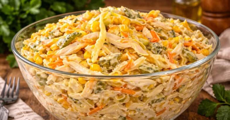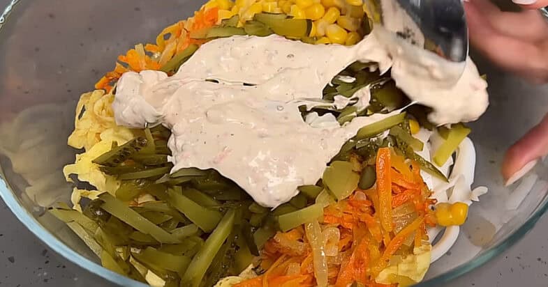 Додаю невелику банку консервованої кукурудзи, попередньо зливши рідину. Мариновані огірочки теж йдуть у салат, нарізаю їх навскіс невеликими шматочками і додаю до інших інгредієнтів. Тепер готую цікаву заправку, яка і є «родзинкою» цього салату. У майонез додаю дрібно нарізаний маринований імбир, трохи зернистої гірчиці та суміш мелених перців. Усе добре перемішую, щоб соус став однорідним і ароматним. Готовим соусом заправляю салат і ретельно перемішую всі інгредієнти.
