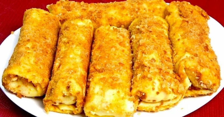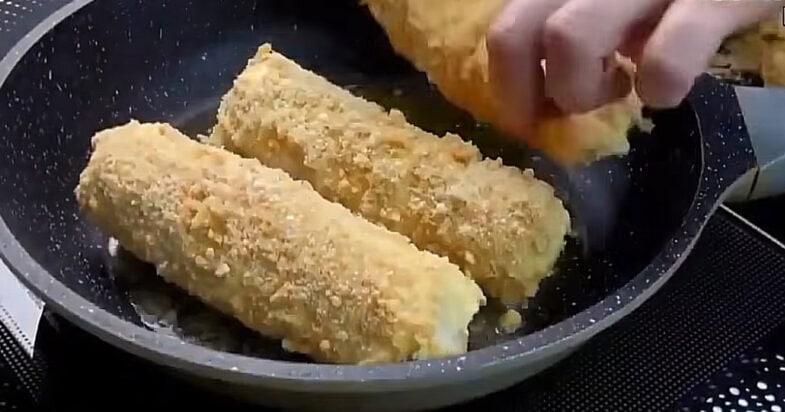 В одній мисці змішую яйця з борошном, в іншу миску всипаю панірувальні сухарі. Занурюю рулети перше у яйця, тоді в сухарі. На сковорідці розігріваю вершкове масло та обсмажую з обох боків до золотистості.