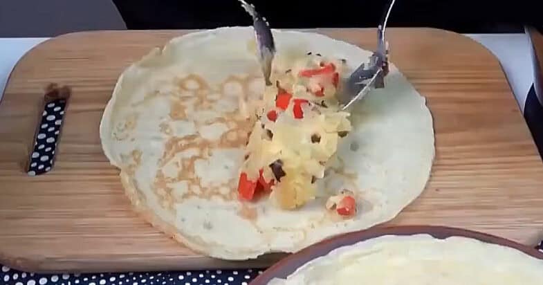 Викладаю начинку на млинці та закручую рулетами.