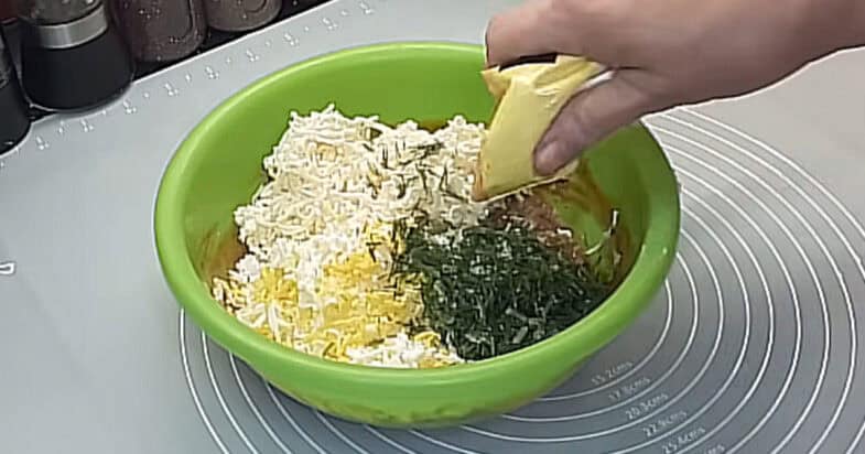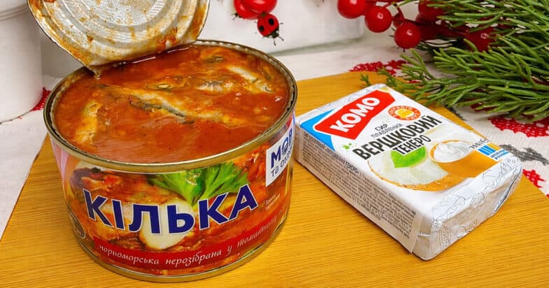 Кільку у томатному соусі перекладаю в миску і добре розминаю виделкою, щоб маса стала однорідною. До розім’ятої рибки я натираю на дрібній тертці варені яйця, потім так само натираю плавлений сирок. Сюди ж натираю зубчик часнику, щоб закуска мала приємний аромат. Далі додаю трохи кропу — у мене він заморожений, але якщо є свіжий, можна взяти свіжий. Потім додаю майонез і добре все перемішую. У результаті виходить дуже смачна і ситна намазка.